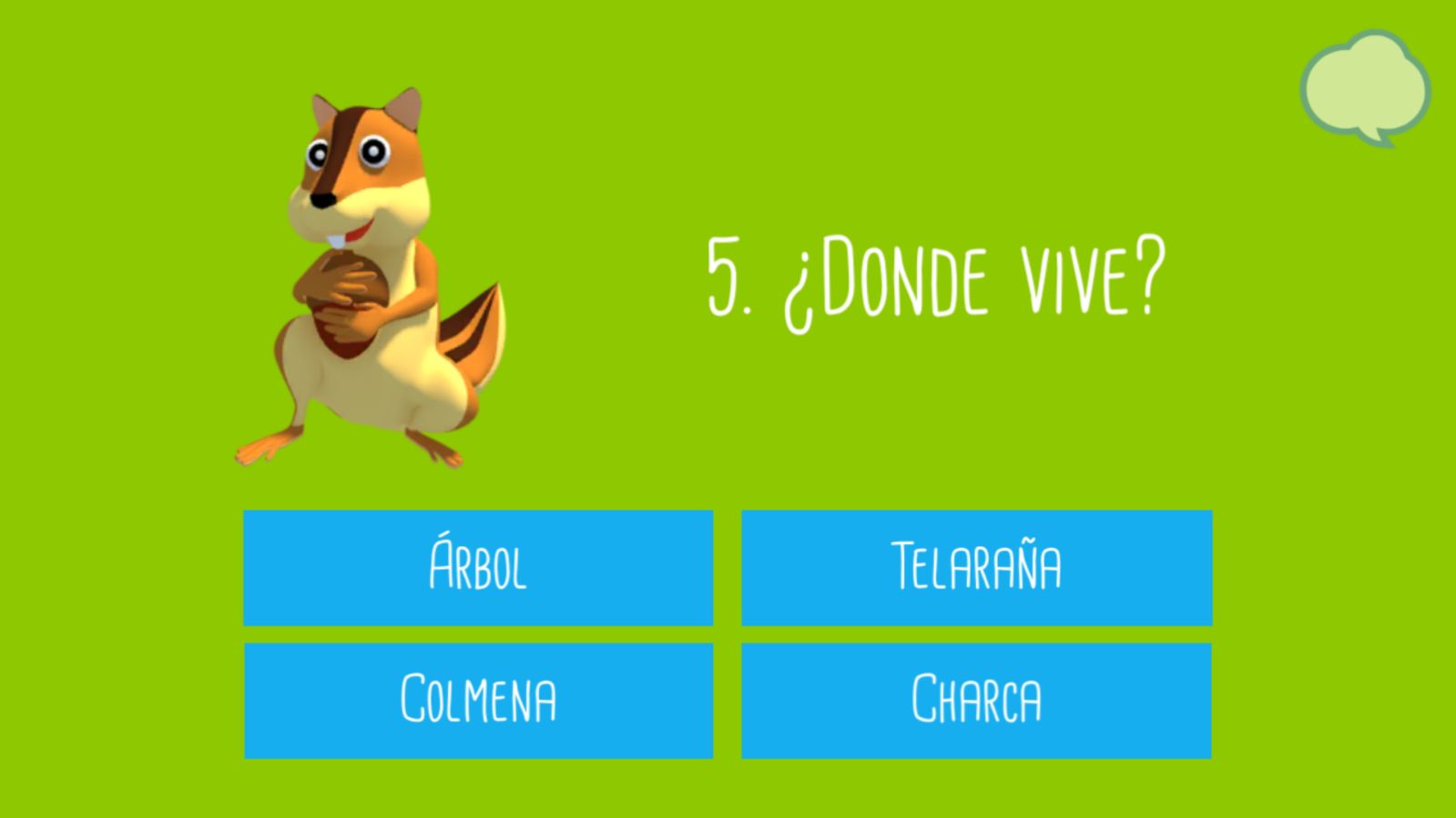 Nosotras no hemos divertido con los 6 animales: El pájaro, el la rana, la araña, la abeja , el pingüino y la ardilla a la vez que vemos la imagen en realidad virtual va presentando a cada animal y explica sobre el entorno en el que viven. Después de formar los 6 puzzles y verlos. Hay que estar muy atentos ,porque te hace un cuestionario de preguntas sobre estos animales.